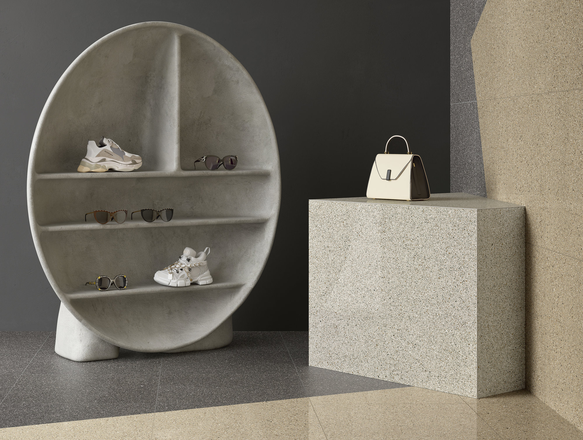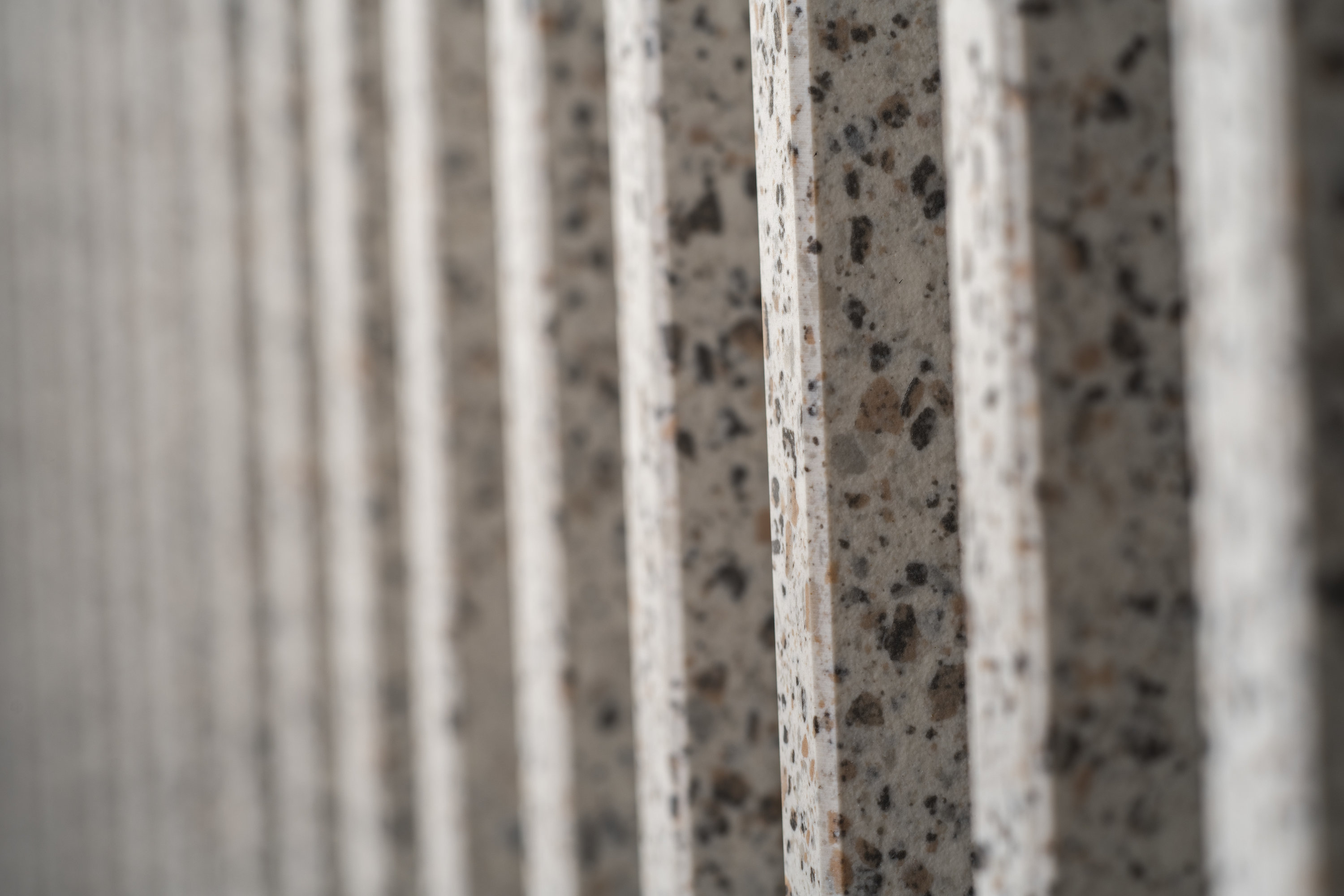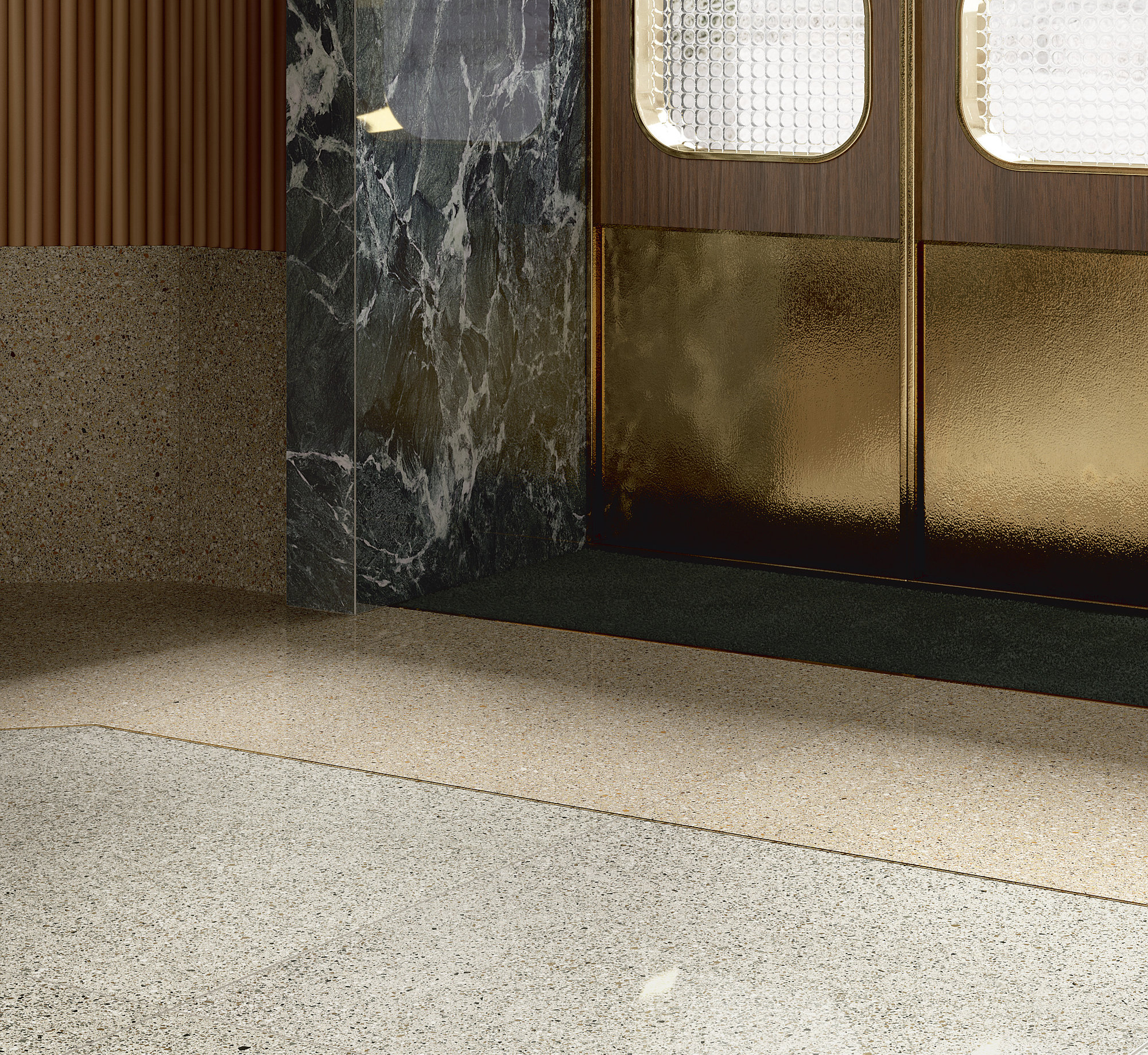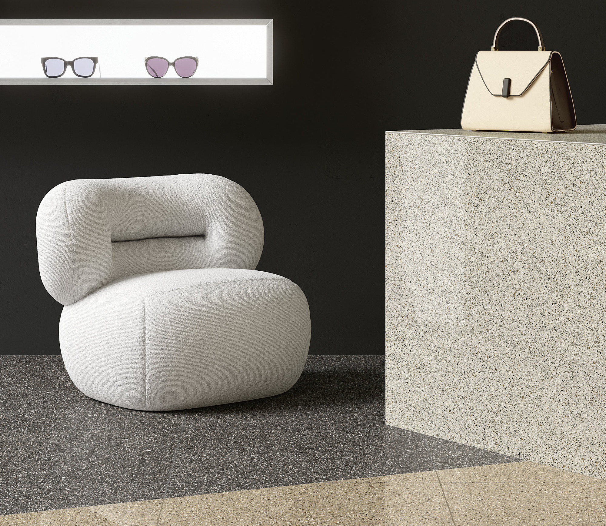 Emana riverberi quasi astrali la mischia ininterrotta di elementi grafici nella tonalità Argento. C’è un bilanciamento impeccabile tra puntinatura chiara e scura, una corrispondenza fluida tra mille toni di grigio che rendono la superficie dinamica, ma anche discreta. L’ambiente ne assorbe e rilascia, al tempo stesso, l’appeal retrofuturista.