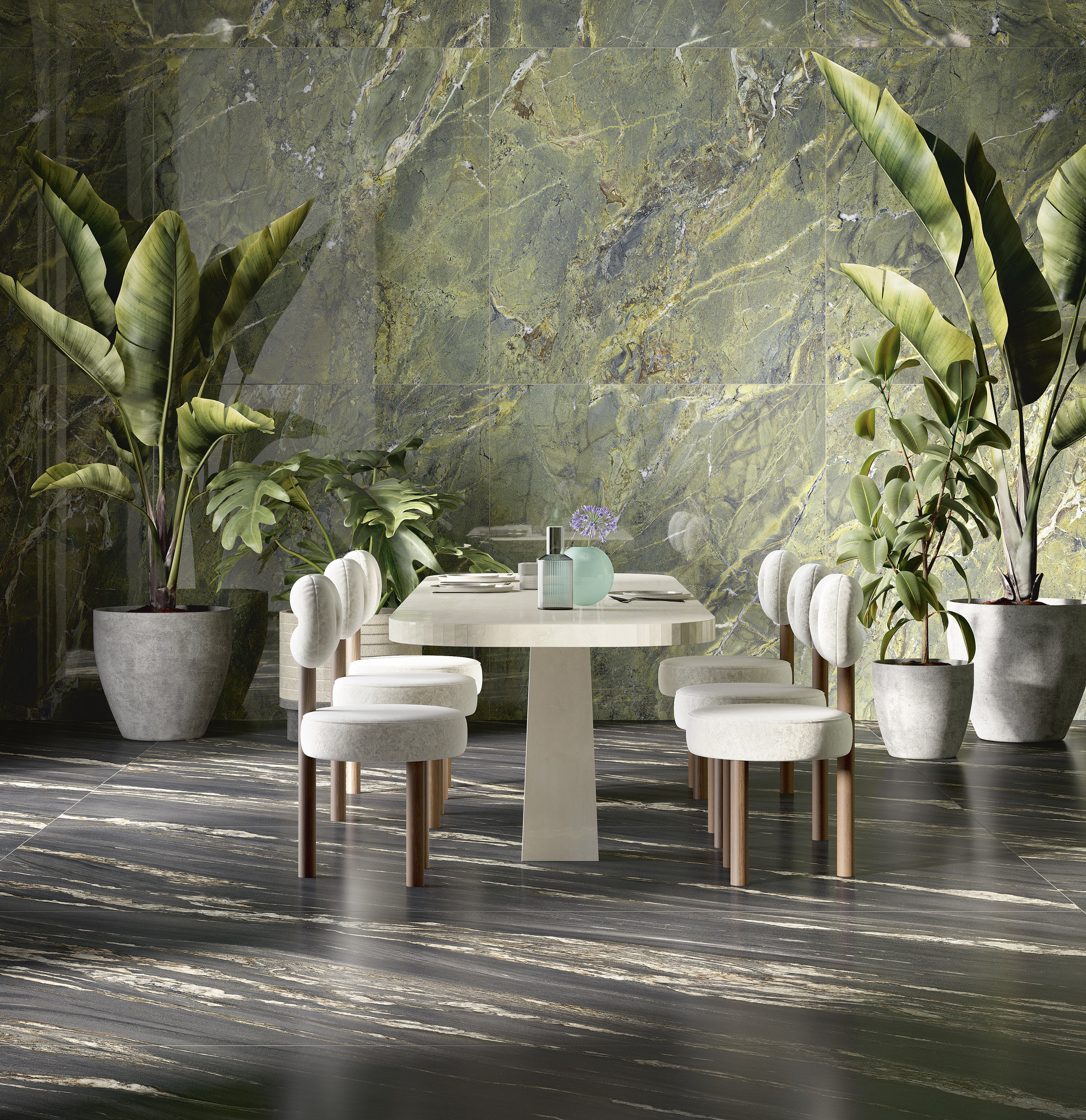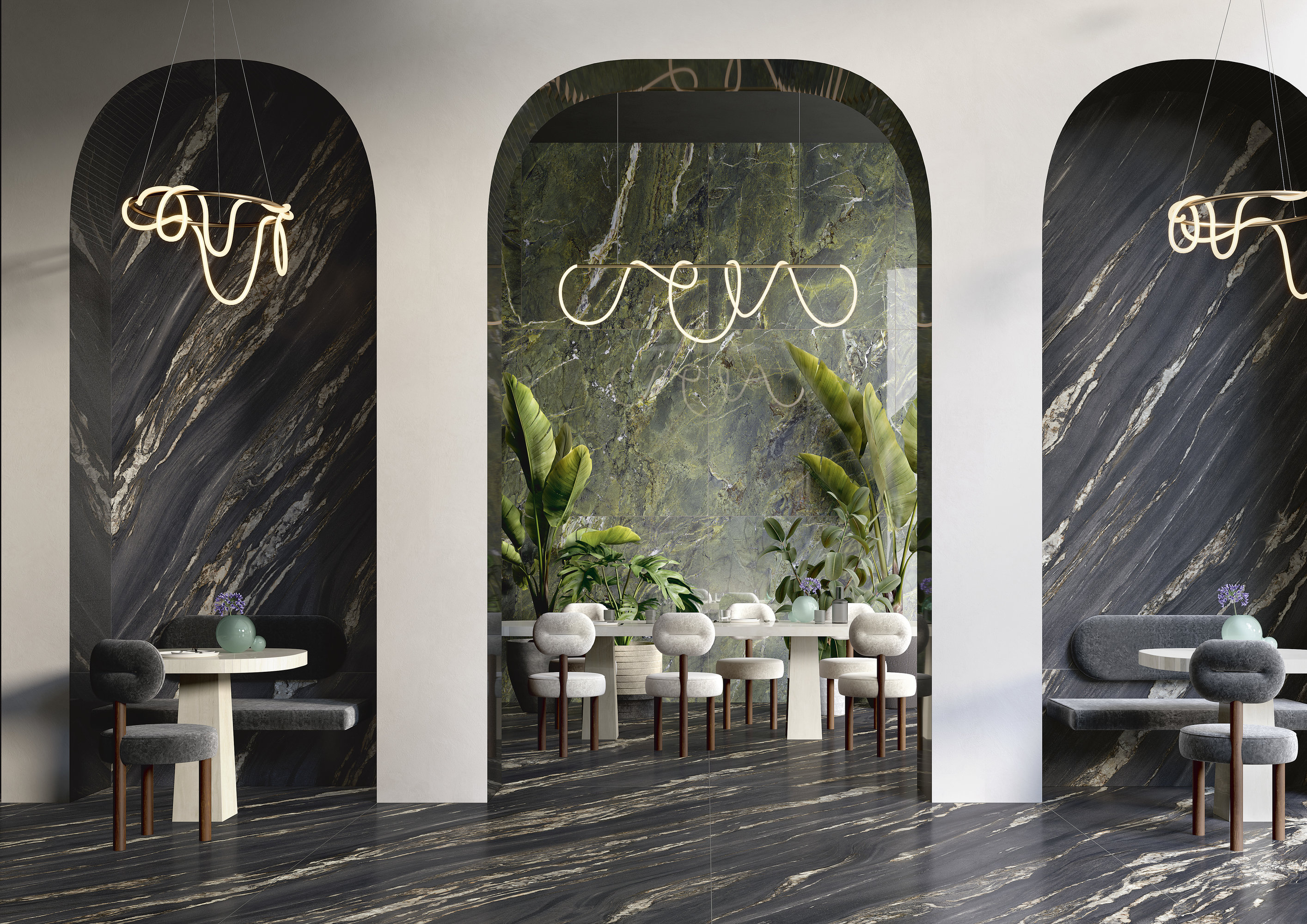 Come un fondale di teatro, il marmo mette in scena opere illuminate da un forte ardore decorativo. Sulla superficie si aprono e s’inseguono arabeschi minerali simili a fiammelle color oro brunastro che, con movimento ondulato, scaldano ed esaltano un manto minerale dall’appeal drammatico e misterioso.